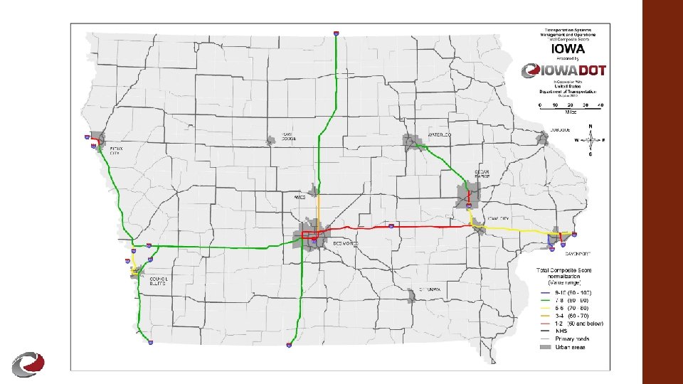 ICE-OPS Structure cont. § § § Each criteria assigned a normalized value (1 -10 scale) based on range of observed values Calculates composite score after applying weighting to each normalized value (max 100) Ranks interstate corridors from an operational perspective