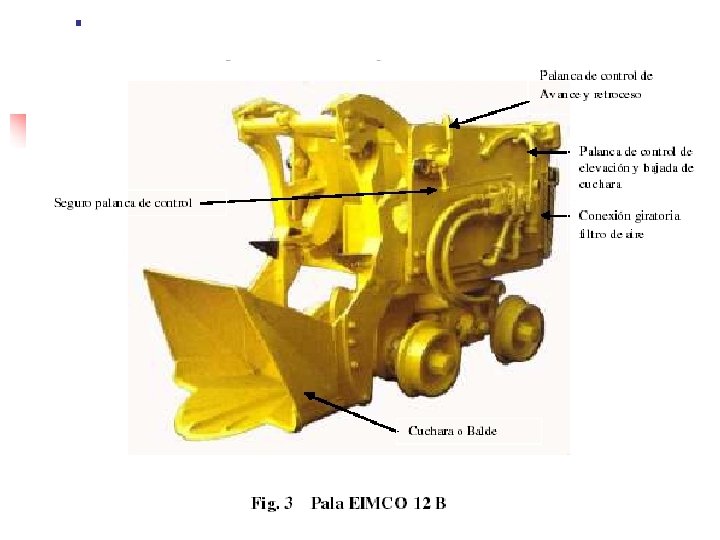 4. LIMPIEZA Y TRANSPORTE MECANIZADO Para la limpieza y transporte mecanizado se requiere el siguiente equipo y herramientas: - Locomotora a batería se 1 -1/2 t. (Fig. 1) - Seis carros mineros V-30 o U-35 (Fig. 2) - Una pala Eimco 12 B o similar (Fig. 3) - Un encarrilador (Fig. 4) - Llave crescent de 12” - Dos piezas rieles de 4’ o dos piezas canales de 7. 5’ - Dos barretas - Cuatro durmientes de fierro o madera