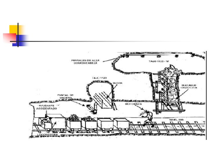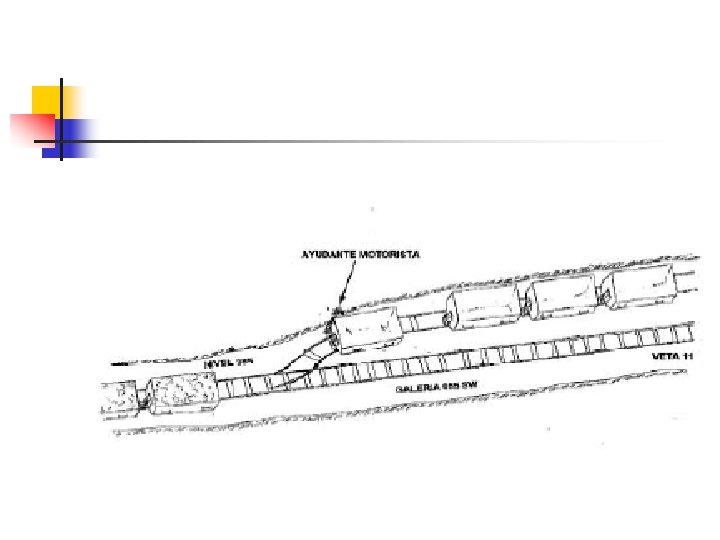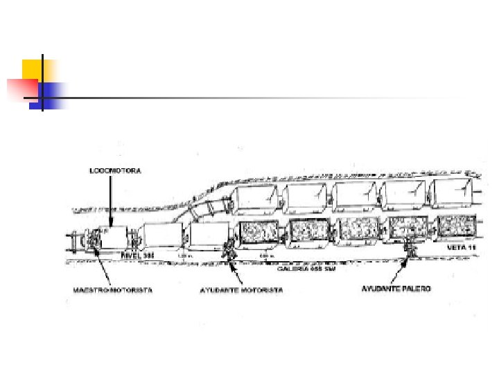 4. 3. CAMBIO Y CARGUIO DE CARROS MINERO - El operador mueve la locomotora con los dos carros hacia delante, entra al desquinche y deja el carro vacío 3 y se va al tope para proceder al carguío del carro 2 - De esta manera se continúa hasta llenar todos los carros del convoy y luego el operador y su ayudante trasladan el convoy hasta un paso de mineral (ore pass), si el material que se traslada es mineral, o hasta un paso de caja (waste pass), el material es caja o hasta la parrilla del ingenio. - Estos desvíos, para el cambio de carros, no deben estar situados a más de 50 m del frente de trabajo. Posteriormente estos desquinches pueden ser utilizados para refugios o para acopio de materiales.