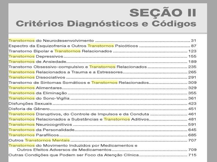 TRANSTORNO MENTAL “Estão frequentemente associados a sofrimento ou incapacidade significativos que afetam atividades sociais, profissionais ou outras atividades importantes. ” “O diagnóstico de um transtornos mental não é equivalente à necessidade de tratamento. ” Por consequência, não ter diagnóstico específico não exclui a possibilidade de tratamento. DSM-V