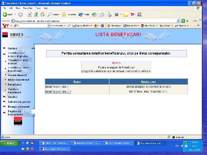 TRANSFERURI SI CREARE DE DEPOZITE BENEFICIARII DUMNEAVOASTRA • Această funcţionalitate permite vizualizarea listei şi • numerelor de conturi ale beneficiarilor predefiniţi la semnarea contractului de subscriere. Beneficiarul poate fi client al BRD sau al oricarei bănci din România. Pentru a avea mai multe informaţii despre un beneficiar, click pe “Numele” său. Adăugarea, modificarea sau ştergerea beneficiarilor poate fi realizată prin contactarea unităţii la care a fost încheiat contractul BRD-NET sau, pentru contractele încheiate pentru persoane fizice, prin contactarea telefonică a serviciului.