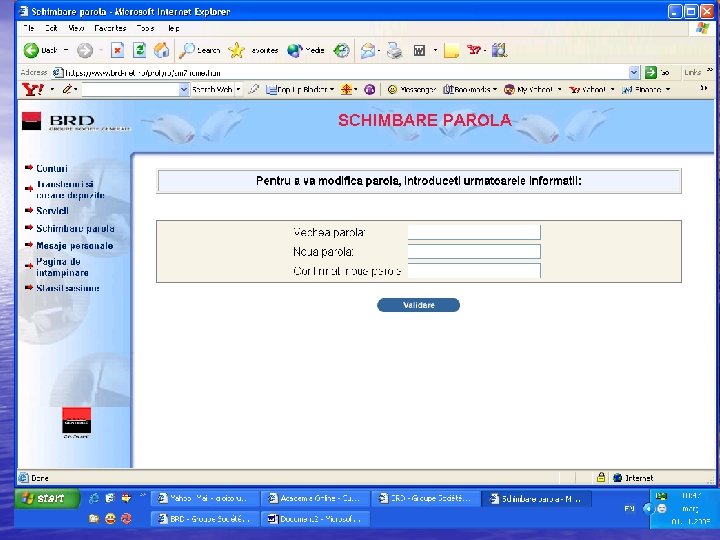 4. PAROLA • Această funcţie este luată în considerare în opţiunile de securitate ale serviciului. Ea va permite schimbarea Parolei, din motive de securitate. Datele care sunt solicitate se referă la introducerea Parolei actuale, a noii Parole şi confirmarea noii Parole. Schimbarea Parolei intră în vigoare imediat.