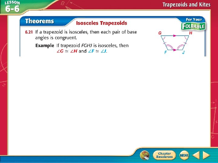 • midsegment of a trapezoid—A segment with endpoints that are the midpoints of two sides of a trapezoid • kite—A quadrilateral with exactly two distinct pairs of adjacent congruent sides.