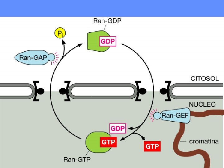 In the nucleus, Ran-GDP → Ran. GTP, by Ran-GEF (guanine nucleotide exchange factor). FYI: Ran slowly hydrolyzes GTP but at an insignificant rate. Ran-GEF (always in the nucleus) binds in the nucleus to Ran-GDP and displaces the GDP allowing GTP to replaces it. In the cytoplasm, Ran-GTP → Ran-GDP, by Ran-GAP (GTP hydrolysis activating protein). Ran-GAP (always in the cytoplasm) binds Ran-GTP and stimulates GTP hydrolysis, so a phosphate group drops off, creating GDP.
