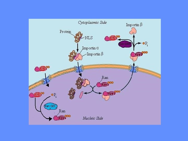 Cargo binding and release from the karyopherins is controlled by Ran. The asymmetric distribution of the GTPase-activating protein (Ran. GAP) and the guanineexchange factor (Ran. GEF) generate a high Ran. GTP concentration in the nucleus and a high Ran. GDP concentration in the cytoplasm, respectively. Import cargoes bind to their receptors in the cytoplasm in the absence of Ran. GTP. In the nucleus, Ran. GTP binds to the import complex and triggers the release of the import cargoes. By contrast, export complexes form obligate trimeric complexes that contain receptor, cargo and Ran. GTP. Export complexes are dissociated in the cytoplasm where they encounter the Ran. GAP, and the Ran. GTP is hydrolysed to Ran. GDP.