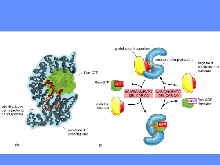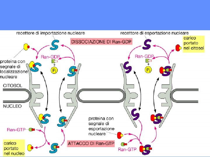 LA PROTEINA RAN E’ UN REGOLATORE CHIAVE DEL TRASPORTO DI PROTEINE NEL NUCLEO Nel nucleo RAN GTP GAP GEF guanine nucleotide exchange factor RAN GDP Nel citosol GTP hydrolysis activating protein