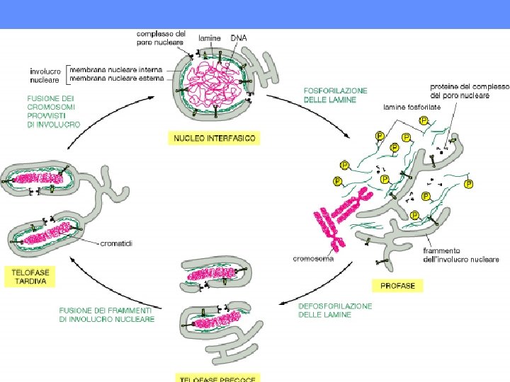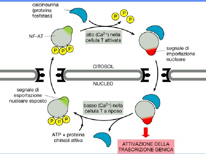SI POSSONO INDIVIDUARE PIU’ TAPPE NEL TRASPORTO NUCLEARE 1. PROTEINE SOLUBILI (IMPORTINE) RICONOSCONO LE NLS 2. IL COMPLESSO IMPORTINE-PROTEINA NUCLEARE SI LEGA ALLE PROTEINE DEL PORO (NUP) (RIPETIZIONI FG) 3. IL PORO SI DILATA ED IL COMPLESSO LO ATTRAVERSA 4. L’IMPORTINA SI DISSOCIA DALLA PROTEINA NUCLEARE 5. L’IMPORTINA TORNA NEL CITOSOL