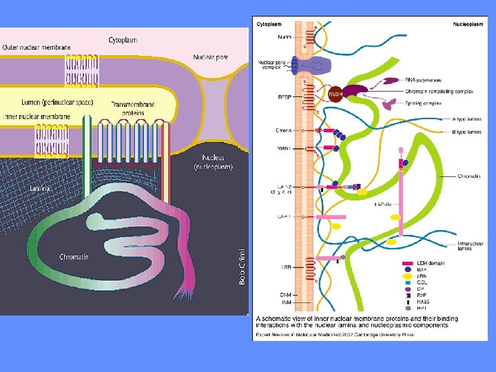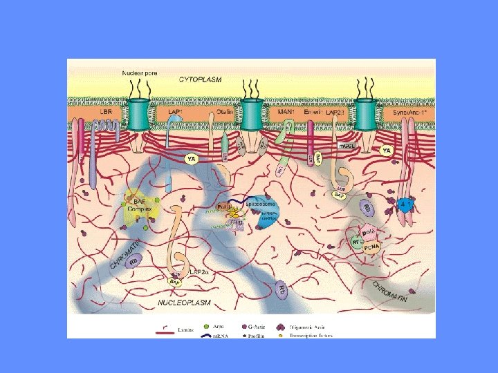 Nuclear lamina functions include: DNA replication. During the process of DNA replication, the DNA undergoes an elongation phase where the DNA is stretched out. Studies have indicated that the nuclear lamina provide a support structure for the DNA during this process. Additionally, there have been some indications that free lamin polypeptides may play part in a regulatory role during DNA replication. Nuclear Support. The intermediate fibers that comprise part of the nuclear lamina, help provide structure and support to the nucleus similar to the way the intermediate fibers in the cytoplasm provide support and structure to the rest of the cell. Chromatin organization. With the help of lamin polypeptides the nuclear lamina binds to the chromatin at matrix attachment regions (MAR) which are 300 -1000 base pair sequences in the DNA. Cell cycle regulation. At the beginning of mitosis, the nuclear lamina along with the nuclear membrane and pores start to breakdown, allowing for the chromosomes to intact and bind with the mitotic spindle. Then at the end of mitosis, these 3 structures reassemble to once again encapsulate the nuclear contents. Cell development and differentiation. In embryonic studies of some birds and mammals, five different forms of lamin have been discovered: LI and LII considered to be similar to lamins B 1 and B 2; LIII considered to be similar to a B-type lamin; LA considered to be homologous to lamin type-A; and a fifth type that is specific to germ cells only. Lamins LI, LII and LIII (the Btype) appear to be expressed more in the earlier stages of embryonic development while the A and C-type lamins become significantly expressed in the later stages of development. Apoptosis, also known as cellular suicide involves the early breakdown of nuclear lamina. Without this step, the well coordinated apoptosis process would not continue. Even though there may be only a few genes that code for nuclear lamina, various mutations to these genes are responsible for a number of human heritable diseases including: Emery-Dreifuss muscular dystrophy Limb girdle muscular dystrophy Dilated cardiomyopathy (DCM) with conduction system disease Familial partial lipodystrophy FPLD) Autosomal recessive axonal neuropathy (Charcot-Marie-Tooth disorder type 2, CMT 2) mandibuloacral dysplasia (MAD) Hutchison Gilford Progeria syndrome (HGS) Greenberg Skeletal Dysplasia Pelger-Huet anomaly (PHA) Restrictive dermopathy Nuclear lamina, originally thought to be nothing more than a nuclear skeletal support system is far more complex than this. It is a multifunctional key structure to the nucleus. Any defects in the nuclear lamina can be catastrophic to the overall heath of the organism as the list of diseases above illustrates. l.