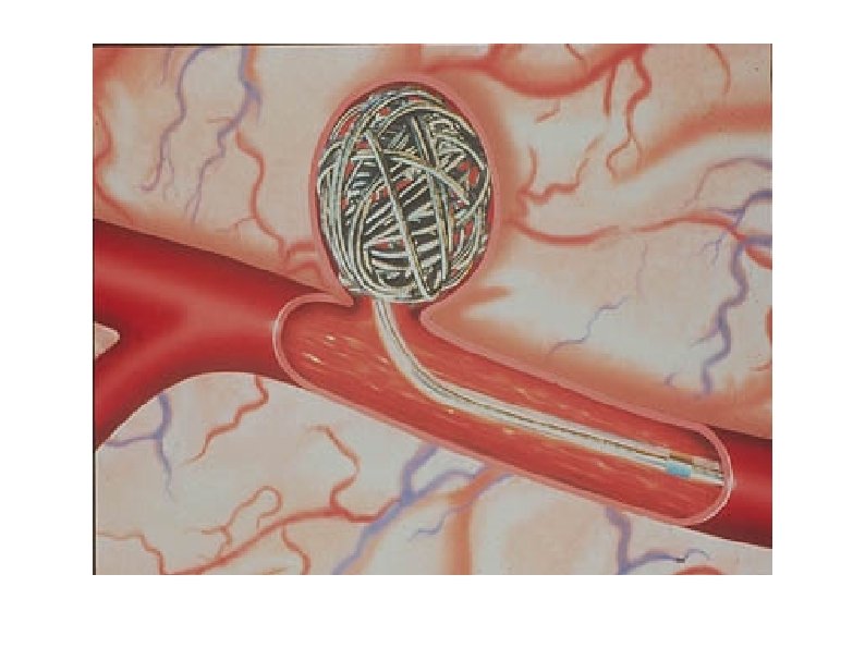 TRATAMIENTO ENDOVASCULAR • La embolización coils permite abordar el aneurisma desde el interior del vaso sanguíneo. El procedimiento se realiza bajo imagen radioscópica, ingresando un catéter a través de una arteria, habitualmente la femoral, alcanzando el saco aneurismático por técnica de micro-cateterización rellenando su lumen con múltiples coils con el objetivo de lograr su exclusión. • Ventaja de su efectividad en la fase aguda. • En las primeras 72 horas previene el resangrado y el vasoespasmo