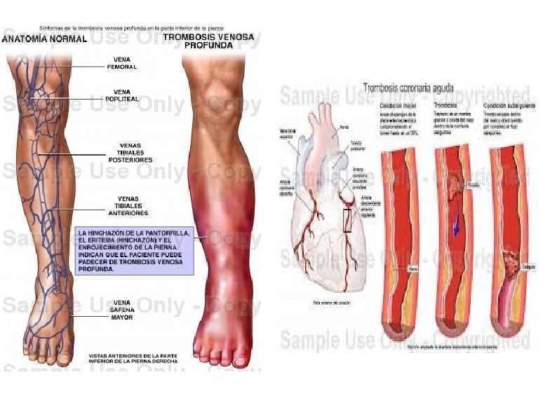 MANIFESTACIONES CLINICAS. La sintomatología depende del grado de oclusión de la arteria o la vena, los síntomas comunes son: Dolor, hinchazón, dificultad en la marcha, varices, isquemia (trombos arteriales), la piel sobre la vena o arteria esta enrojecida, eritematosa y caliente. Nota: alrededor del 50% de los pacientes con trombosis venosa profunda son asintomáticos.