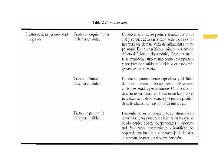 Tipos diferenciados en los sistemas de clasificación Millon (1981) y Características que comparten los T. P. : inflexibilidad; círculos viciosos; fragilidad emocional y Descripciones de los T. P. siguiendo siempre un esquema: 1. 2. 3. 4. 5. 6. x Conducta observable del individuo Conducta interpersonal Estilo cognitivo o proceso de pensamiento que realiza Cómo muestra las emociones Percepción de sí mismo Cuáles so los mecanismos de defensa primarios utilizados Tabla 16. 2