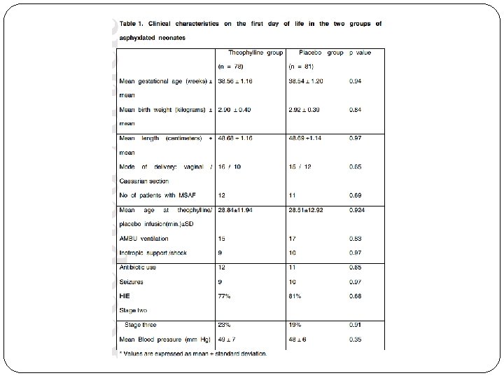 Resultados Um total de 159 pacientes preencheram os critérios de inclusão de asfixia perinatal: 78 recém-nascidos foram inscrito no grupo teofilina 81 foram incluídos no grupo do placebo. Não houve diferenças significativas no peso ao nascer, idade gestacional, sexo, taxa de cesariana, a presença de líquido amniótico tinto com mecônio, índice de Apgar ou o número de bebês que exigiu reanimação ao nascimento (Tabela 1).