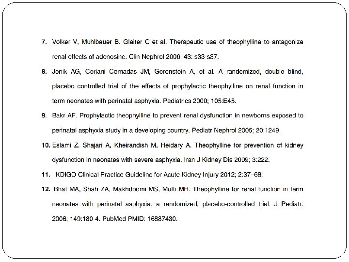 Outros estudos B. O Estudo de Jenik (8): Investigaram os efeitos da teofilina em 60 RN com asfixia perinatal, com dose única (8 mg / kg) para 24 RN na primeira hora de nascimento. Eles observaram que 4 recém-nascidos no grupo teofilina tinham lesão renal aguda em comparação com 15 crianças no grupo placebo. {No presente estudo, a lesão renal aguda ocorreu em 12 (15%) crianças do grupo teofilina e 39 (48%) no grupo placebo (p <0, 01)}. § A incidência de oligúria, anúria e asfixia foi significativamente menor no grupo com teofilina.