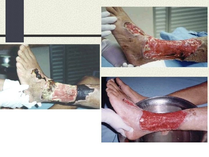 Debridamento mecânico Fricção: Gazes Esponjas macias umedecidas Do centro para fora da ferida Úmido seco: Deixar gaze úmida até secar e depois se puxa. Dolorosa Não seletiva, remove também tecido vivo.