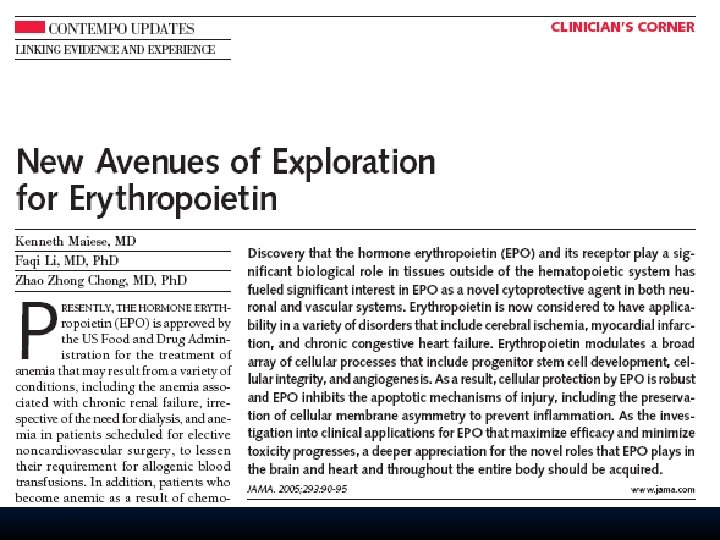 Efectos pleiotrópicos de EPO en roedores y humanos: Antiapoptosis (caspasas) Antininflamatorio Protector de radicales libres Aumento de supervivencia celular Protege miocardio de necrosis en IAM En ICC mejora función miocárdica (HVI y F Ejecc).