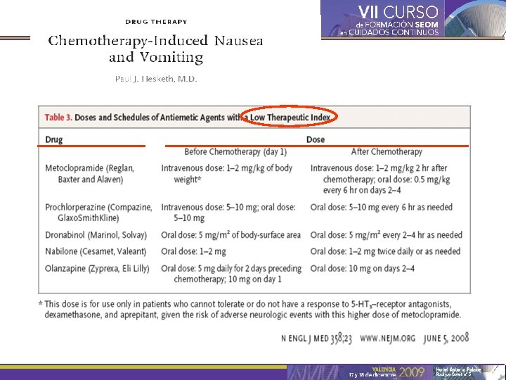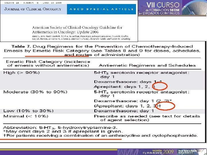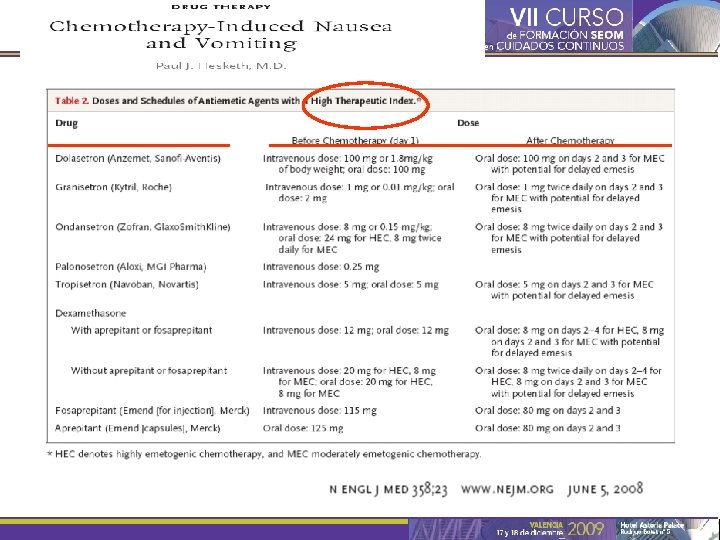 Objetivos del tratamiento antiemético • Principal: – Prevenir las NVIQ de la forma más completa posible. • Relacionados: – Aportar un tratamiento que sea lo más cómodo posible para los pacientes y el personal sanitario. – Minimizar el impacto de las NVIQ sobre la calidad de vida relacionada con la salud. – Reducir la hospitalización, el uso global de recursos sanitarios y los costes asociados. – Eliminar los posibles efectos adversos del tratamiento. Berger AM, Clark-Snow RA. In Cancer: Principles and Practice of Oncology. 7 th ed. Philadelphia: Lippincott Williams & Wilkins, 2004: 2515– 2523; Gralla RJ et al J Clin Oncol 1999; 17(9): 2971– 2994.