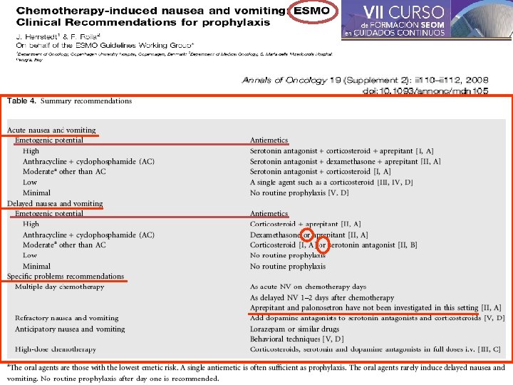 RECOMENDACIONES ( según riesgo emetógeno) ALTO: Emesis aguda: anti 5 HT 3 + corticoesteroide + aprepitant (IA) Emesis retardada: corticoesteroide + aprepitant (IIA) MODERADO: Emesis aguda (AC): anti 5 HT 3 + corticoest. + aprepitant (IIA) Emesis aguda (otros): anti 5 HT 3 + corticoesteroides (IA) Emesis retardada (AC): aprepitant o corticoesteroide (IIA), Emesis retardada (otros): corticoesteroide oral (IIA) o anti 5 HT 3 (IIB) BAJO: Corticoesteroide (III, IV D) para emesis aguda; no prevenir la diferida. MÍNIMO: No de rutina, si no hay antecedentes (V y consenso D)