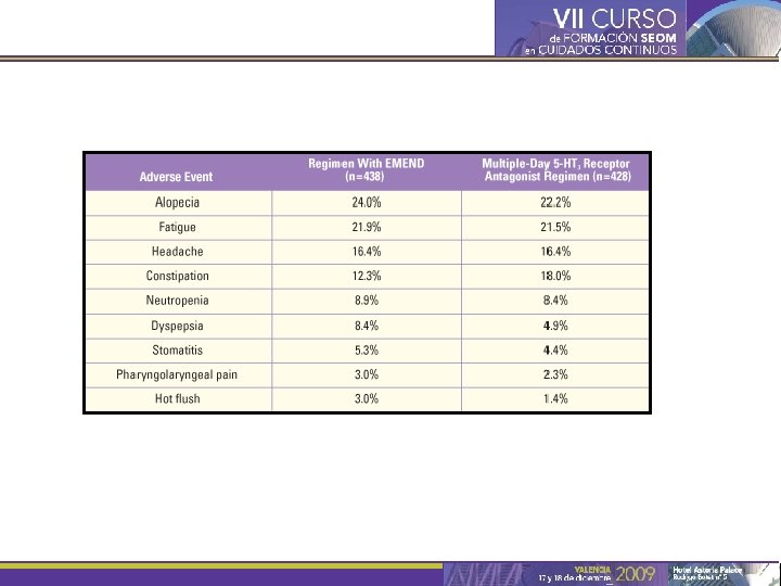 INCIDENCIA DE NAUSEAS Y VOMITOS EN ESTUDIOS RECIENTES ESQUEMA NÁUSEAS G 1 NÁUSEAS G 3 -4 -2 VÓMITOS G 1 -2 VÓMITOS G 3 -4 AC (USO) 75% 8% 47% 6% FAC (BCIRG) 78% 9, 5% 52% 7, 3% TAC (BCIRG) 70% 5% 40% 5% TAC (BCIRG 005) - 4, 5% - 4, % FEC (GEICAM) - 6% - 10% AC→D (BCIRG 006) - 5, 8% - 6, 1% FAC (GEICAM) 40% (G 2 -3 -4) 34% (G 2 -3 -4) TAC (GEICAM) 39% (G 2 -3 -4) 28% (G 2 -3 -4) CTCAE v 3. 0