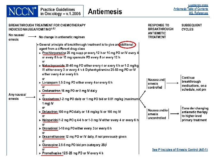 Options for Breakthrough CINV l Additional agents should be from a different drug class than initial therapy l Possible options include dopamine antagonists, metoclopramide, butyrophenones, cannabinoids, corticosteroids, or agents such as lorazepam NCCN Practice Guidelines in Oncology – Version 1. 2007. Antiemesis, MS-1.