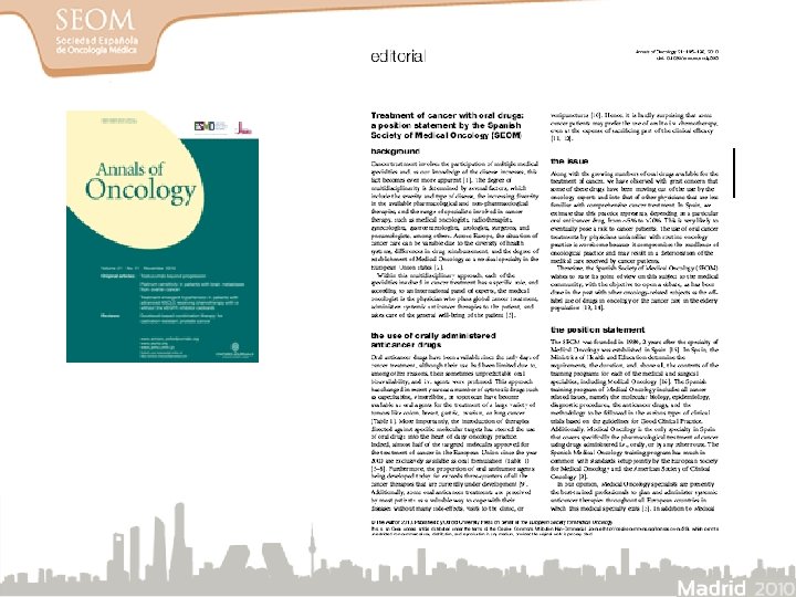 Summary • The prescription of anticancer drugs by physicians who are not oncology experts may compromise the current standards of safety and efficacy in the medical care offered to cancer patients and the high quality of cancer research. • SEOM wishes to alert our European Medical Oncology colleagues, the European national health care providers, the international oncology community as a whole, and the general public about this situation and to encourage awareness among health care providers.