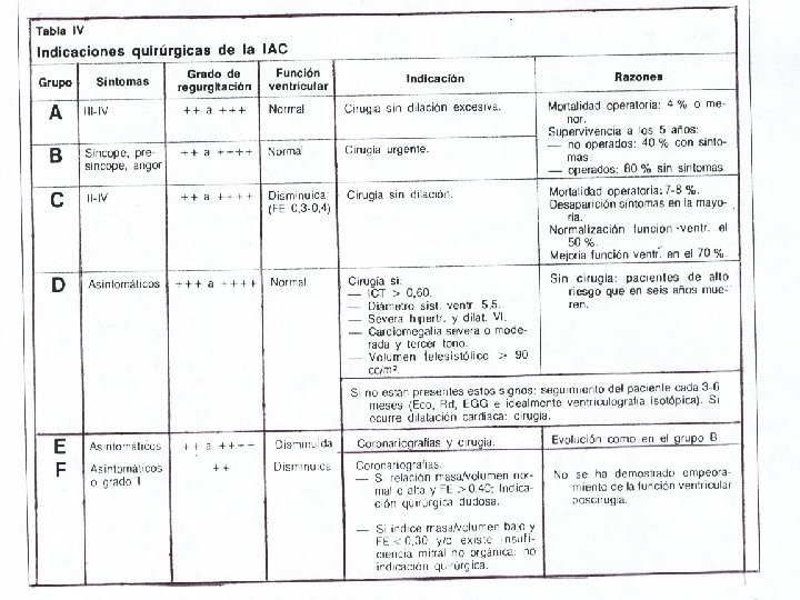n Indicaciones quirúrgicas. Ptes asintomático con signos clínicos de estenosis severa y signos de hipertrofia de VI, si se demuestra gradiente VI-AO mayor de 40 mm. Grados asintomático II-IV demostrado el Dx. Angor, síncope o presíncope demostrado el Dx. No se indicará Cx con solo valores de gradiente VI-aorta. Existe indicación quirúrgica incluso con severa disfunción ventricular (FE 0, 20), porque la función del VI con mucha probabilidad ha de mejorar en el postoperatorio. Igual grado sintomático, el grado de deterioro FE < en pacientes con EA y DLA que con IA.