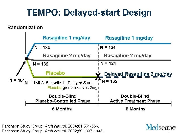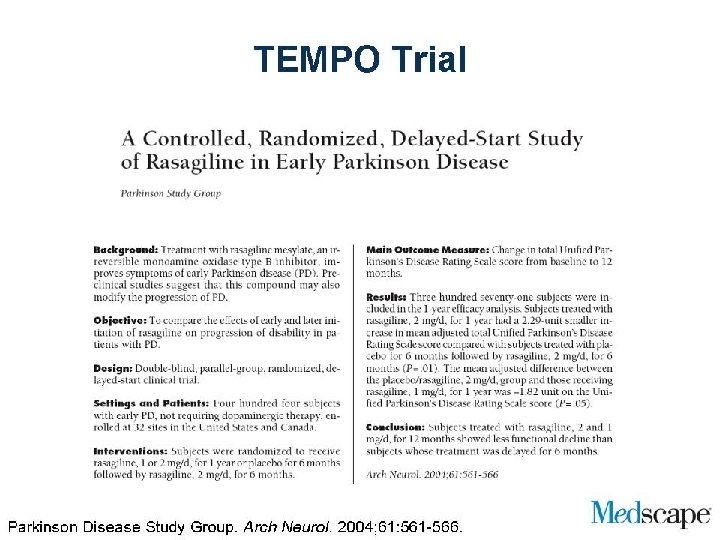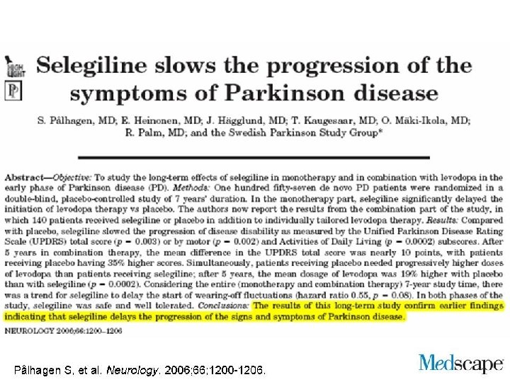 Valori medi di UPDRS totale dal basale alla visita finale (n=371) Rasagiline 1 mg 1. 90 (95% CI 0. 59, 3. 21) Rasagiline 2 mg 1. 66 (95% CI 0. 36, 2. 96) Delay-2 mg 3. 75 (95% CI 2. 49, 5. 00) Delay-2 mg vs Rasagiline 1 mg Delay-2 mg vs Rasagiline 2 mg PSG, Arch Neurol, 2004; 61: 561 p=0. 0508 p=0. 0134
