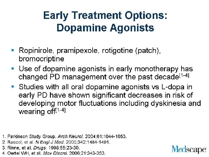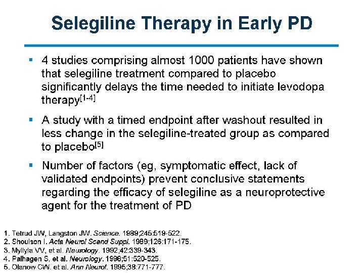 Studi di neuroprotezione Misura di outcome e risultati Selegiline Time to levodopa Confounded Selegiline Time to wearing off Confounded Lazabemide Time to levodopa Confounded Riluzole Time to levodopa Negative Co-enzyme Q 10 UPDRS (Positive) Immunophilin Time to levodopa Negative Pramipexole SPECT scan (Positive) Ropinirole PET scan (Positive) TCH 346 Time to levodopa Negative Rasagiline UPDRS (wash in) (Positive) Jun Kinase inhibitor Time to levodopa Negative Remacemide In progress Time to levodopa