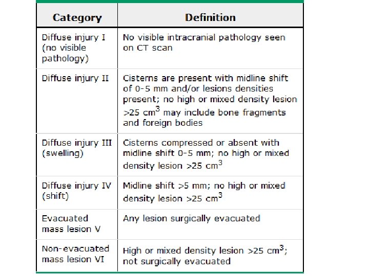 CATEGORIZACION TOMÓGRAFICA Seis grados de lesión. La estadificación de Marshall describe la relación entre los hallazgos en TC , la mortalidad y la probabilidad de desarrollar hipertensión endocraneana. Trauma severo J Neurotrauma 9: 287 -92, 1992