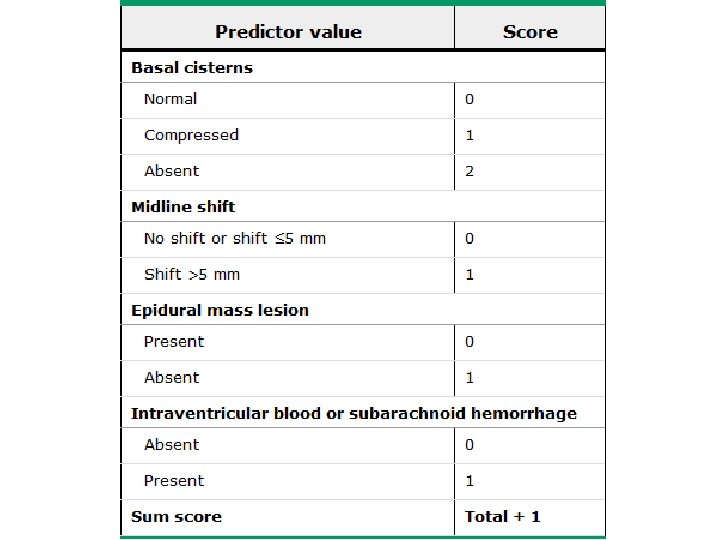 Cisternas basales Desviación de línea media • 3 veces riesco de elevar la PIC • Inversamente relacionado al pronóstico La hemorragia subaracnoidea dobla la mortalidad con un VPP de desenlace fatal en 70%
