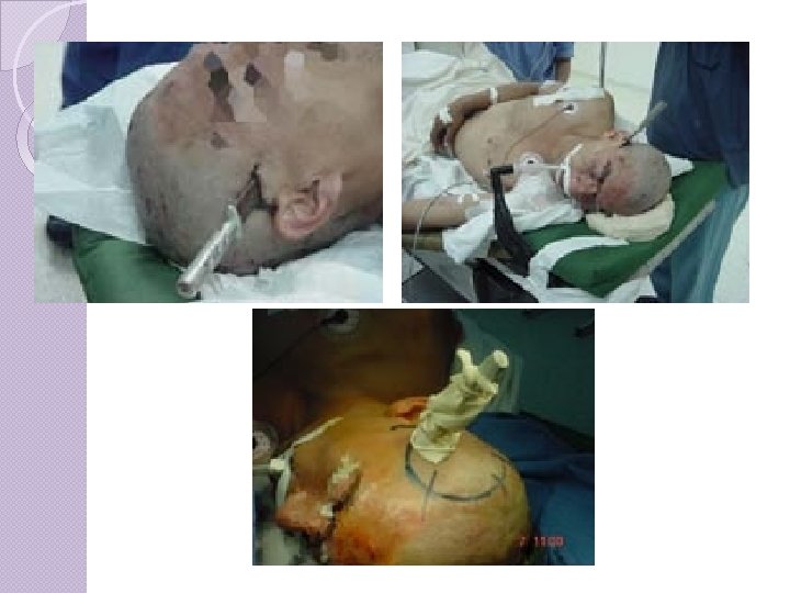 CLASSIFICAÇÃO Ferimento por Arma de Fogo � Mistura de todos os tipo de lesão, fratura, hemorragia, hematomas etc. . . � Quanto maior o calibre e a velocidade do projétil, maior a probabilidade de lesões graves e a até letais. � Cobrir a entrada e saída do projétil compressa esterilizada até o tratamento neurocirúrgico ser providenciado.