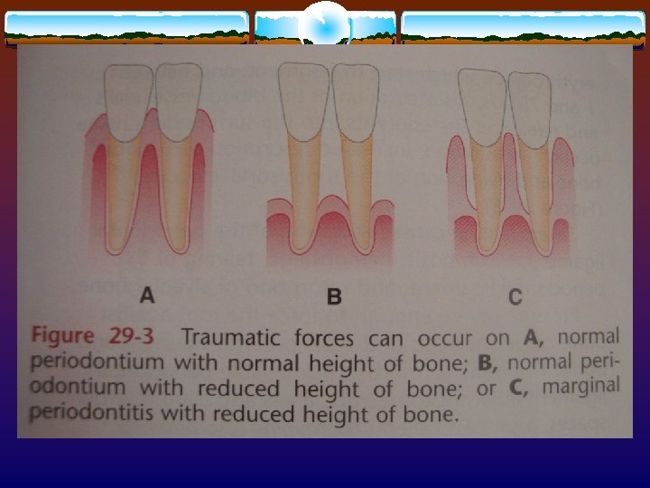 Secondary Trauma from Occlusion v Secondary form is related to situations in which occlusal forces cause injury in a periodontium of a reduced height. This occurs when the adaptive capacity of the periodontium to withstand occlusal forces is impaired by bone loss resulting from marginal inflammation.