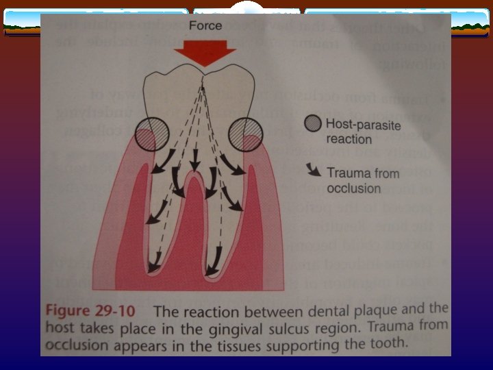 v Tissue injury is produced by excessive occlusal forces, the tissue then attempts to repair and restore the periodontium. This occurs if the forces are diminished or the tooth drifts away from the traumatizing forces. v If the offending force is chronic, the periodontium is remodelled to cushion its impact. The ligament is widened at the expense of the bone resulting in angular defects without periodontal pockets and the tooth becomes mobile.