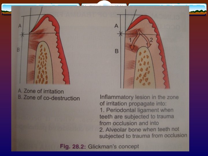 GLICKMAN’S CONCEPTS 1965, 1967: v We know that the normal path of progression of periodontal diseases is: v Gingiva → Alveolar bone → PDL v He said that trauma altered this path of spread of infection to: v Gingiva → PDL → Alveolar bone