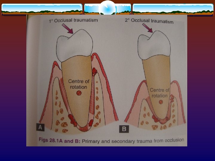 Primary Trauma from Occlusion v Primary form includes a tissue reaction or damage elicited around a tooth with normal height of periodontium. v The changes in the periodontium are because of changing occlusal forces and the local alterations to which a tooth is subjected from occlusion. :