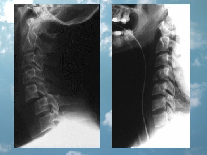C-spine evaluation • bone and soft tissue • X-ray exam: „one view is no view”, L-all 7 C+Th 1 (30% inj. C 7 Th 1), AP-vertical alignment of the spinous and articular process and abnormalities in joint and disc spaces, open mouth view integrity of the atlanto-occipital and atlanto-axial joints, the odontoid process, oblique – intervert. foramina • CT • lateral cervical spine - sensitivity of about 85% 92% in a three view series 100% when selective CT scanning is employed