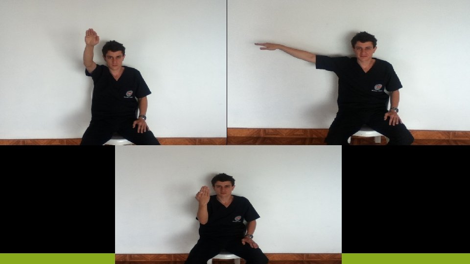 MIEMBRO INFERIOR ▪ Sección Paciente: ▪ Miembro Superior ▪ Permanezca calmado, relajese y no oponga resistencia a los movimientos de su brazo. ▪ Primero deberá realizar 8 repeticiones de cada ejercicio en cada brazo. ▪ Una vez haya cumplido el punto anterior, pase al siguiente ejercicio. ▪ Ejercicio 1: ▪ Usted deberá encontrarse sentado. ▪ Mantenga su espalda recta ▪ Haga elevación de la pierna simulando golpear un balón de fútbol, pero suavemente ▪ Realice el mismo movimiento anterior, sólo que en esta ocasión, elevará la pierna hacia los lados