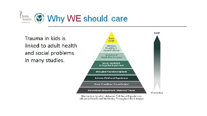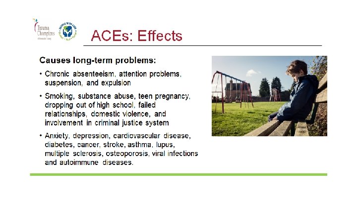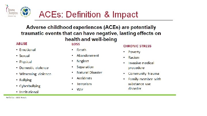 RESOURCES cont: http: //www. cdc. gov/ace/ 2 Specifically, participants were asked whether they had experienced one or more of the following events during childhood: emotional, physical, or sexual abuse; domestic violence; substance abuse, mental illness, or incarceration of a household member; and parental separation. You can access the current version of the ACE study questionnaire at http: //acestudy. org/ace_score.