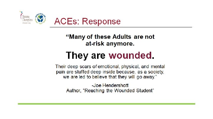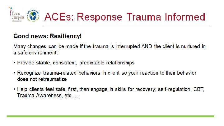 ACE’s Response: Trauma Informed It wasn’t until I finally entered a recovery oriented, trauma-informed treatment program, where I felt safe and respected, that I could begin to heal…Someone finally asked me “What happened to you? ” instead of “What’s wrong with you? ” — Tonier Cain, Team Leader, SAMHSA’s National Center for Trauma-Informed Care