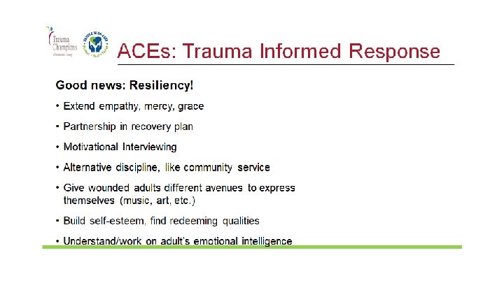 ACE’s Response: Trauma Awareness Many judges have come to recognize that acknowledging and understanding the impact of trauma on court participants may lead to more successful interactions and outcomes Recognizing the impact of past trauma on treatment court participants does not mean that you must be both judge and treatment provider. Rather, trauma awareness is an opportunity to make small adjustments that improve judicial outcomes while minimizing avoidable challenges and conflict during and after hearings.