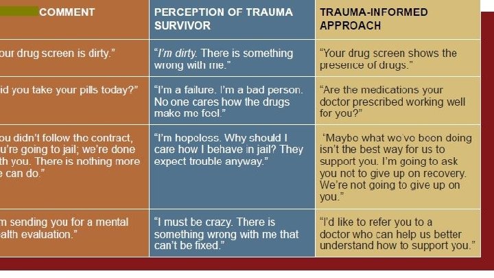TREATMENT REMINDERS ● Client remains in the same support system during treatment ● May be retraumatized by the system ● Retraumatization refers to the psychological and physiological experience of being triggered.