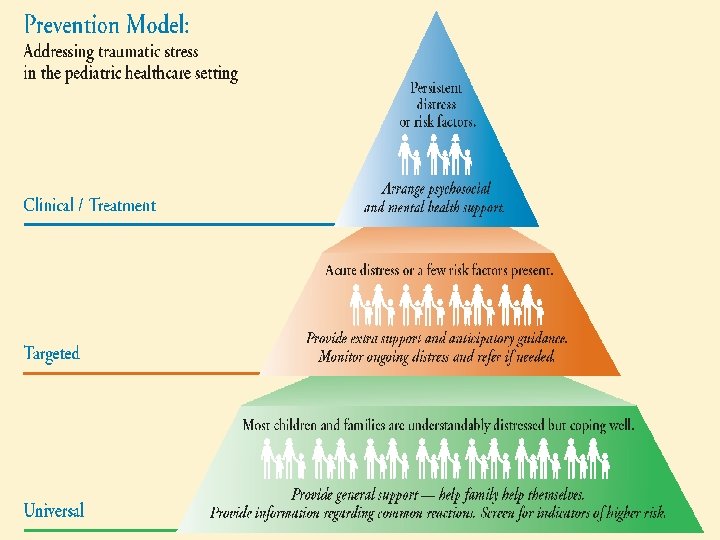 Prevention Model: Levels of Intervention v Universal: Basic support to the widest population of ill and injured children – understand normal reactions and support their inherent competence, resilience and coping strengths. Universal interventions are helpful for most children / families. v Targeted: Early identification of, and intervention with, children and families who have significant risk factors, significant distress, or whose symptoms are interfering with normal functioning and development. v Clinical / Treatment: Identifying and referring children and families with severe distress, impaired functioning, or serious pre-existing issues for mental health assessment / treatment.