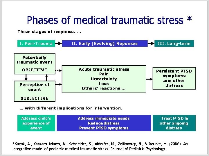 Responses to Medical Trauma v When facing serious illness or injury many pediatric patients and their families are able to cope well, with the basic supportive interventions and with time v Some may develop persistent traumatic stress reactions, such as posttraumatic stress disorder, which impedes both health and psychosocial functioning. v As pediatric health care providers, you have an opportunity to make a difference in how children and their families experience serious illness, injury, and the medical care they receive.