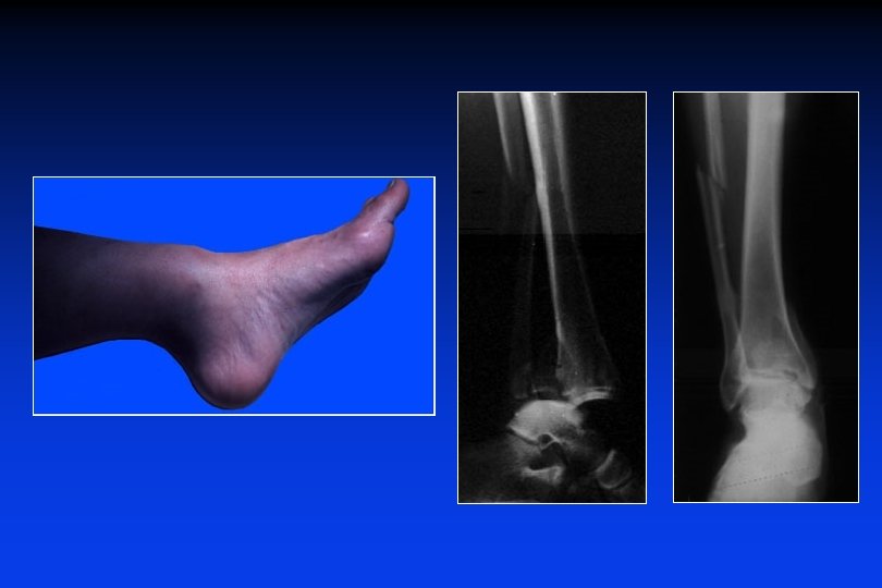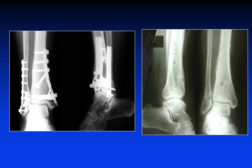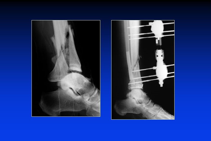 • • Sintesi anatomica del perone (ristabilire la lunghezza) ricostruire la superfice articolare (fili + viti) Fissatore esterno sulla tibia o tra la tibia ed il calcagno