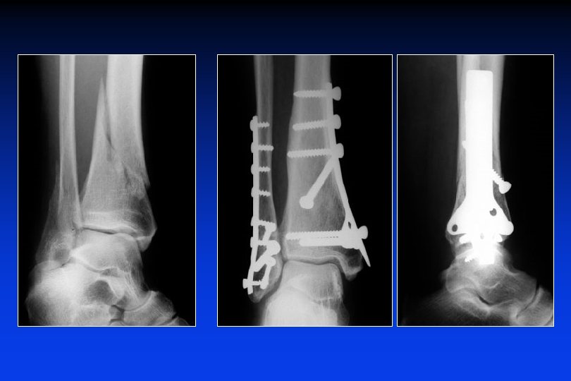 Fratture del pilone tibiale + malleoli Osteosintesi : 1 placca sul malleolo esterno, 1 vite sul malleolo interno e 3 viti di richiamo sul frammento posteriore