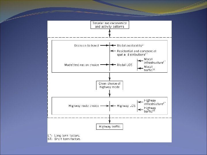 Traveler Decisions �Four key traveler decisions need to be studied and modeled: �Temporal decisions – the decision to travel and when to travel �Destination decisions – where to travel (shopping centers, medical centers, etc. ) �Modal decisions – how to travel (auto, transit, walking, biking, etc) �Route decisions – which route to travel (I-66 or Rt 50? )