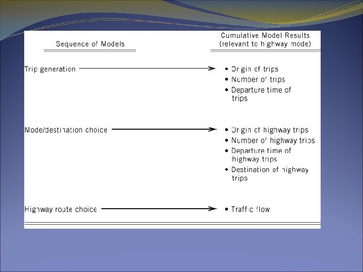 Trip Generation �Objective of this step is to develop a model which can predict when a trip will be made �Typical input information �Aggregate decision making units – we study households not individual travelers typically �Segment trips by type – three types 1) work trips 2) shopping trips and 3) social/recreational trips �Aggregate temporal decisions – trips per hour or per day