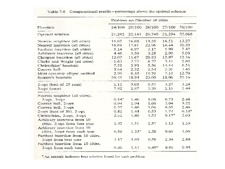Nearest Insertion Heuristic 1. Start with a subgraph consisting of city i only. 2. Find city k such that is minimal and form the subtour (i, k). 3. Find city k not in the subtour and city l in the current subtour such that , where j denotes a city not in the current subtour and i denotes a city in the current subtour. 4. Find the edge { i, j } in the subtour which minimizes. Insert k between i and j. 5. Go to step 3 unless we have a Hamiltonian cycle.