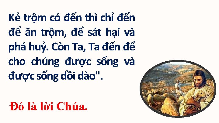 Tất cả những kẻ đã đến trước đều là trộm cướp, và chiên đã không nghe chúng. Ta là cửa, ai qua Ta mà vào, thì sẽ được cứu rỗi, người ấy sẽ ra vào và tìm thấy của nuôi thân.
