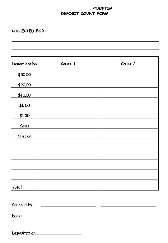 #8 Money In & Money Out: Deposits Use Deposit Count Form every time you count or collect money. � Two people count the money. � Two people promptly deposit money into PTA’s bank account. � Attach deposit slip to Deposit Count Form.