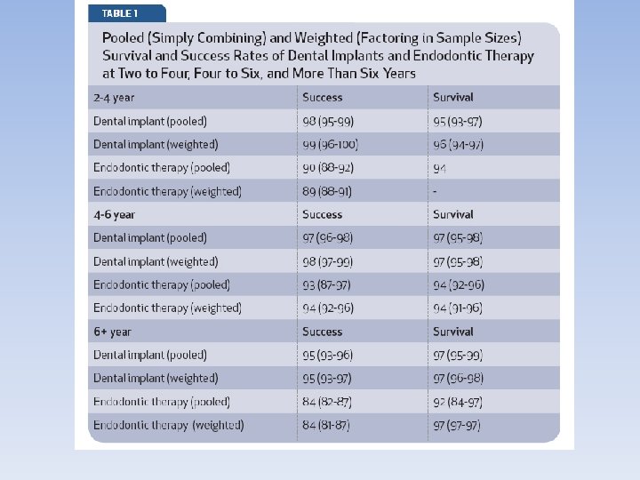 Endodontics and implants: ‘success’ vs. ‘survival’ – concept of ‘survival’ is applied to implant studies – 1. 5 million teeth from an insurance company database. The treatments were provided both by general dentists and endodontists, and a 97% retention rate followed up for 8 years was reported – the high success rates for implants may not be duplicated at the general practitioner level